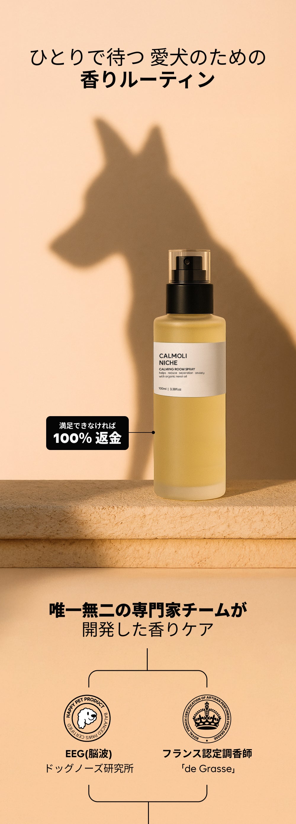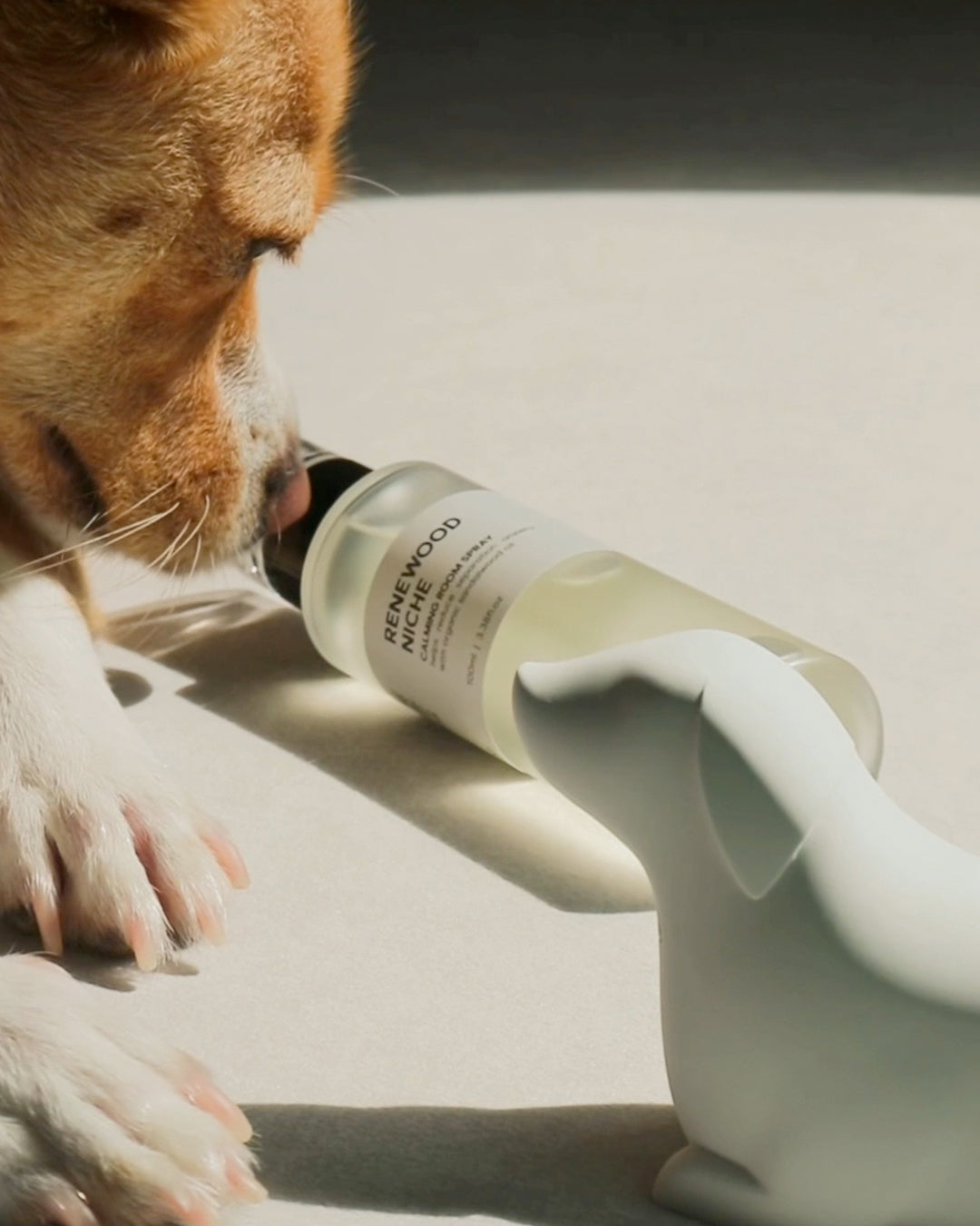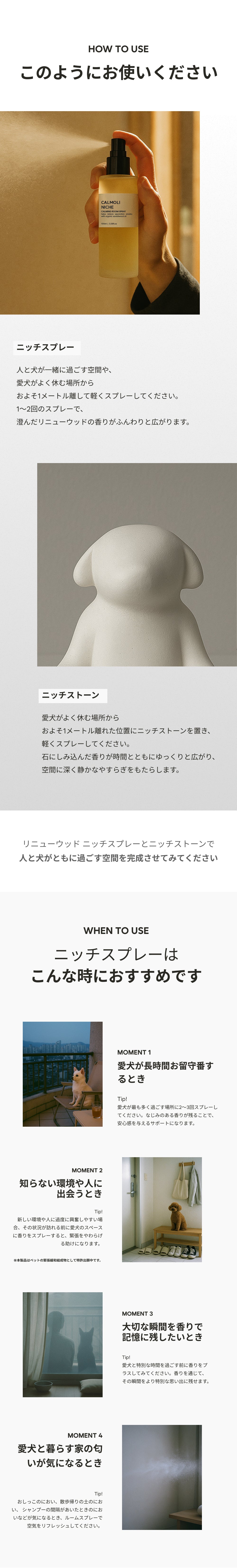 「スプレーが犬と人の空間に穏やかな香りを広げ、セラミックストーンがその香りをやさしく長く保ちます。インテリア以上の存在として、毎日の暮らしに落ち着きを添えるルーティンセットです。」