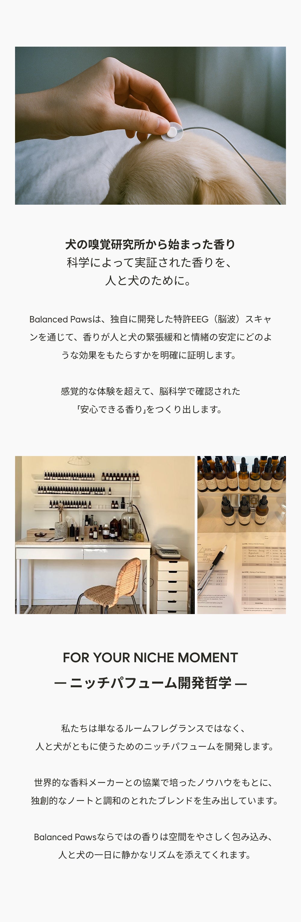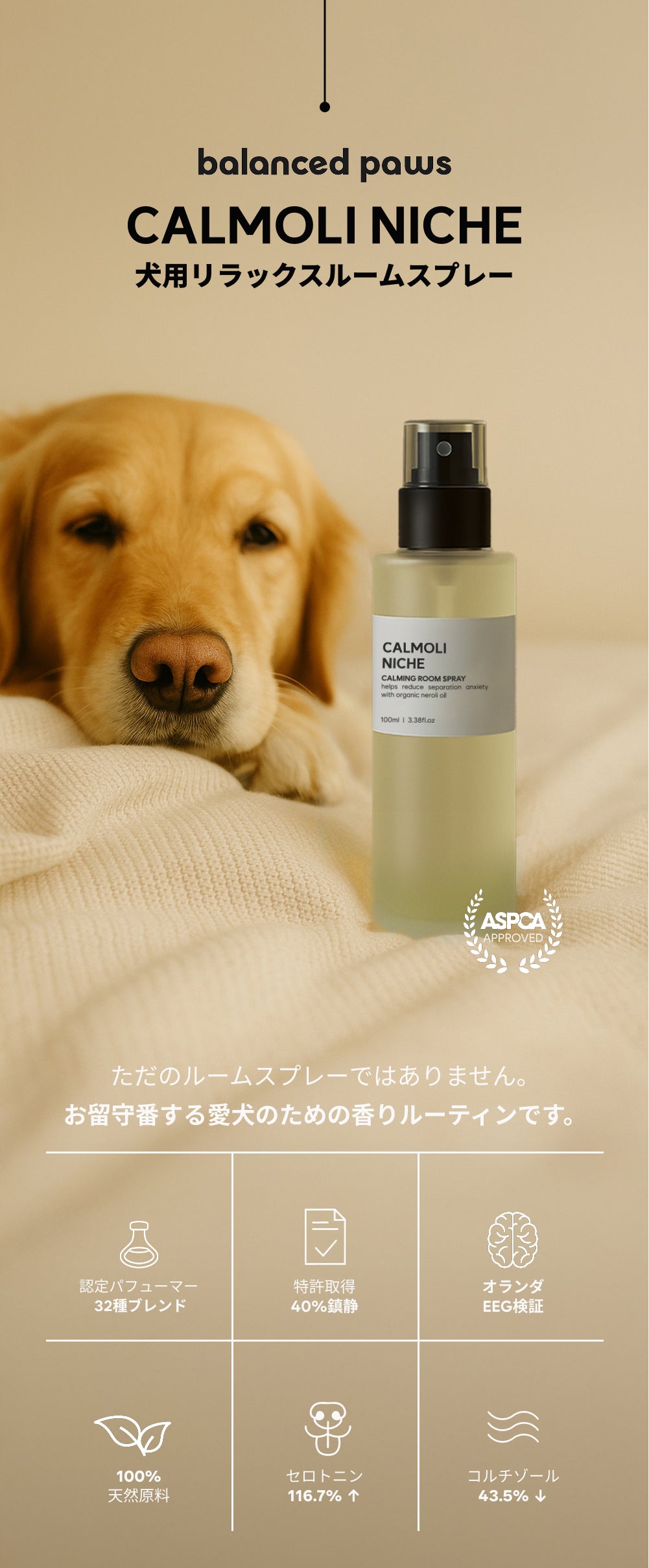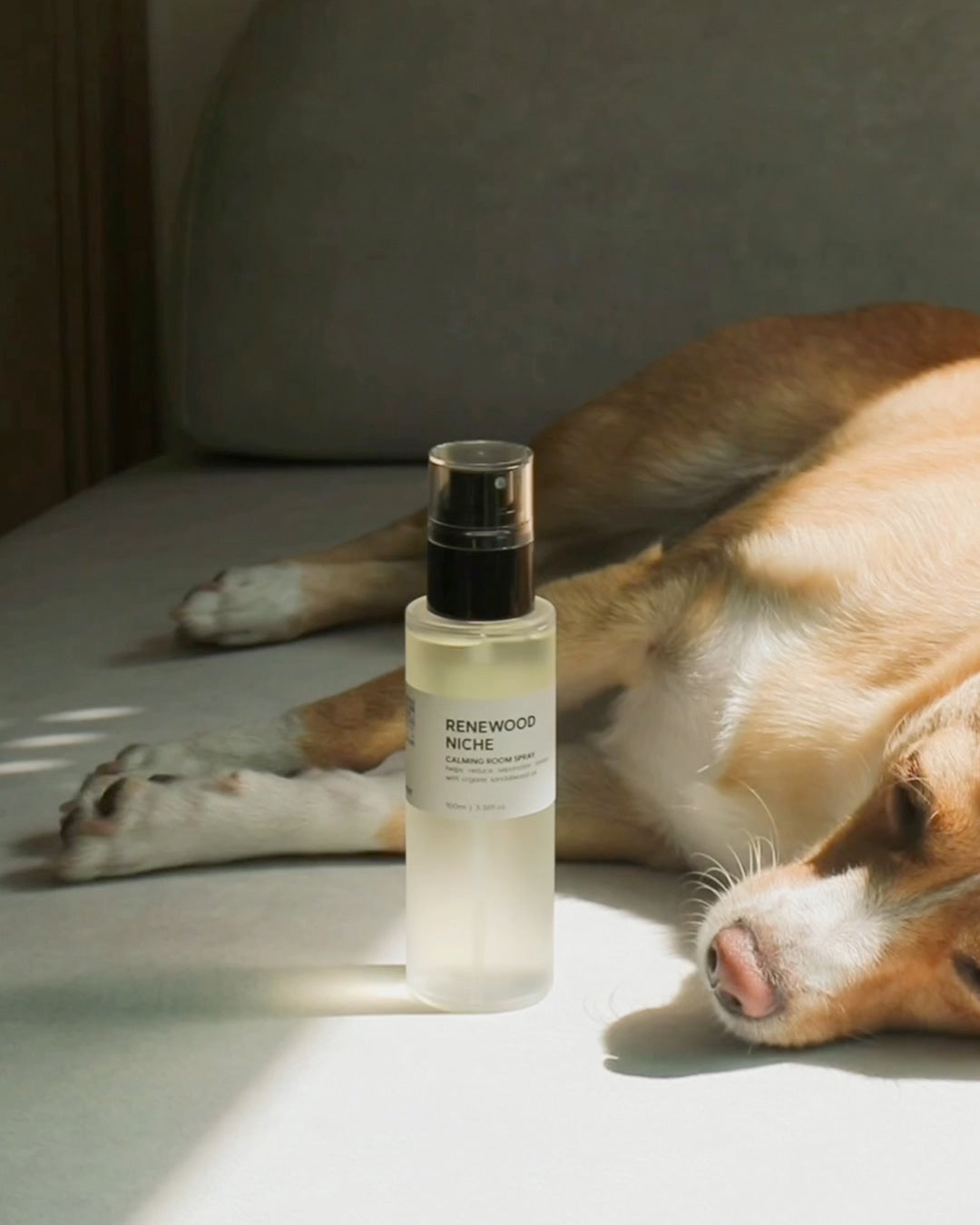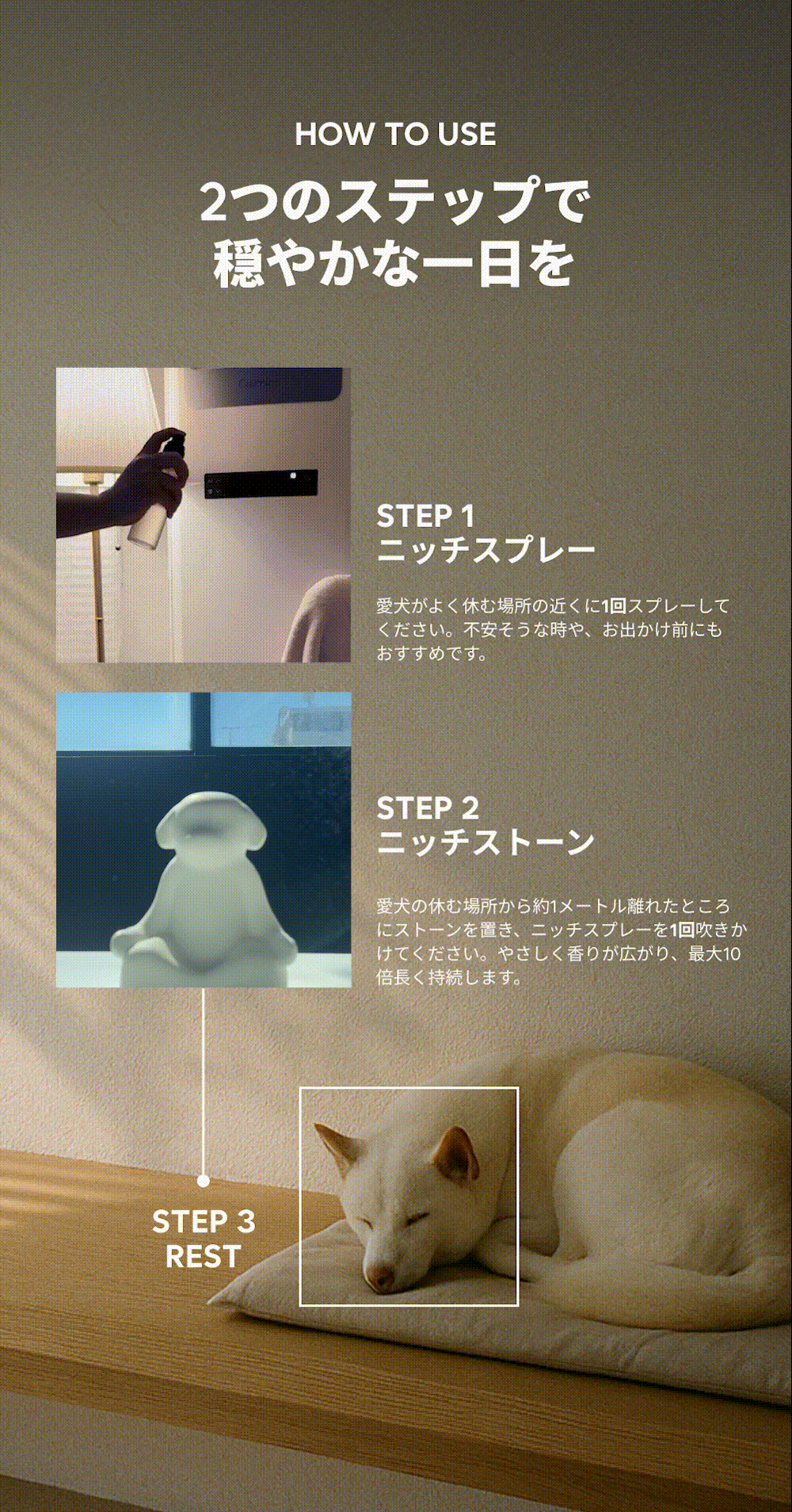 「スプレーが犬と人の空間に穏やかな香りを広げ、セラミックストーンがその香りをやさしく長く保ちます。インテリア以上の存在として、毎日の暮らしに落ち着きを添えるルーティンセットです。」