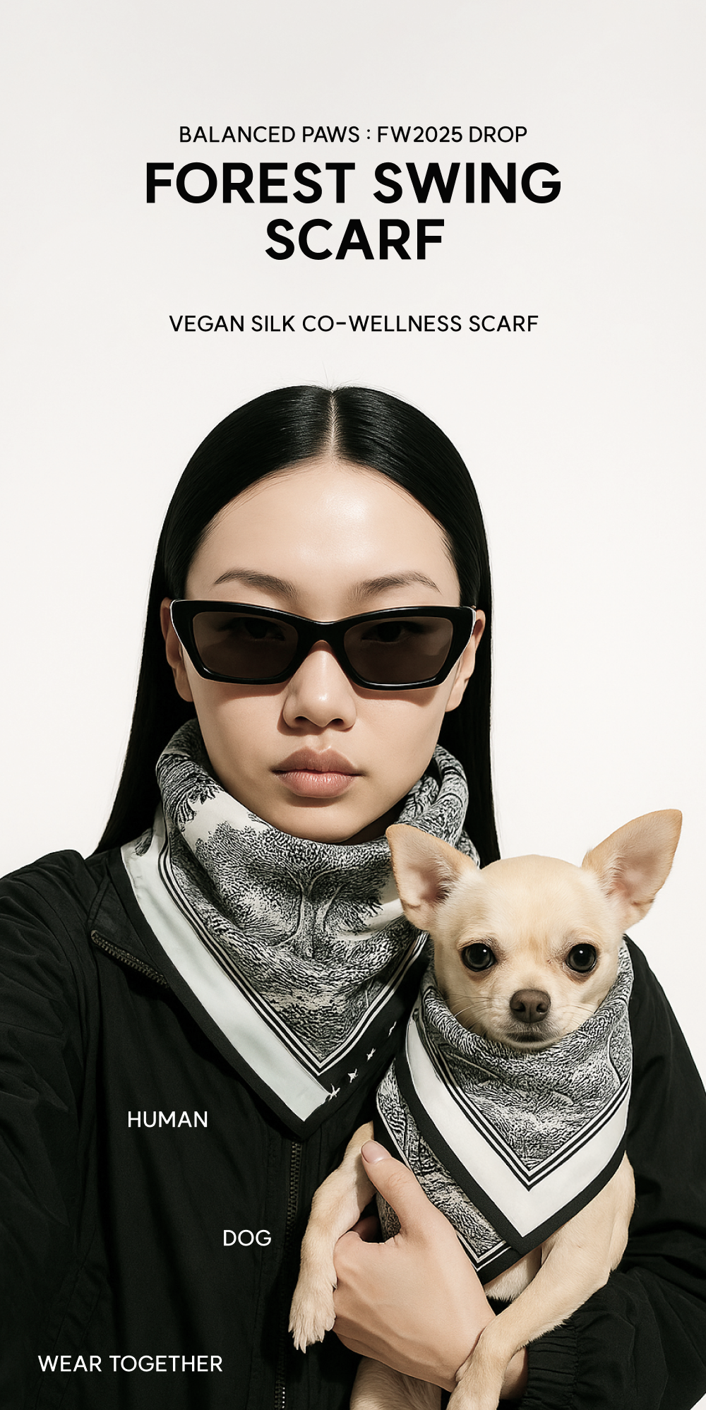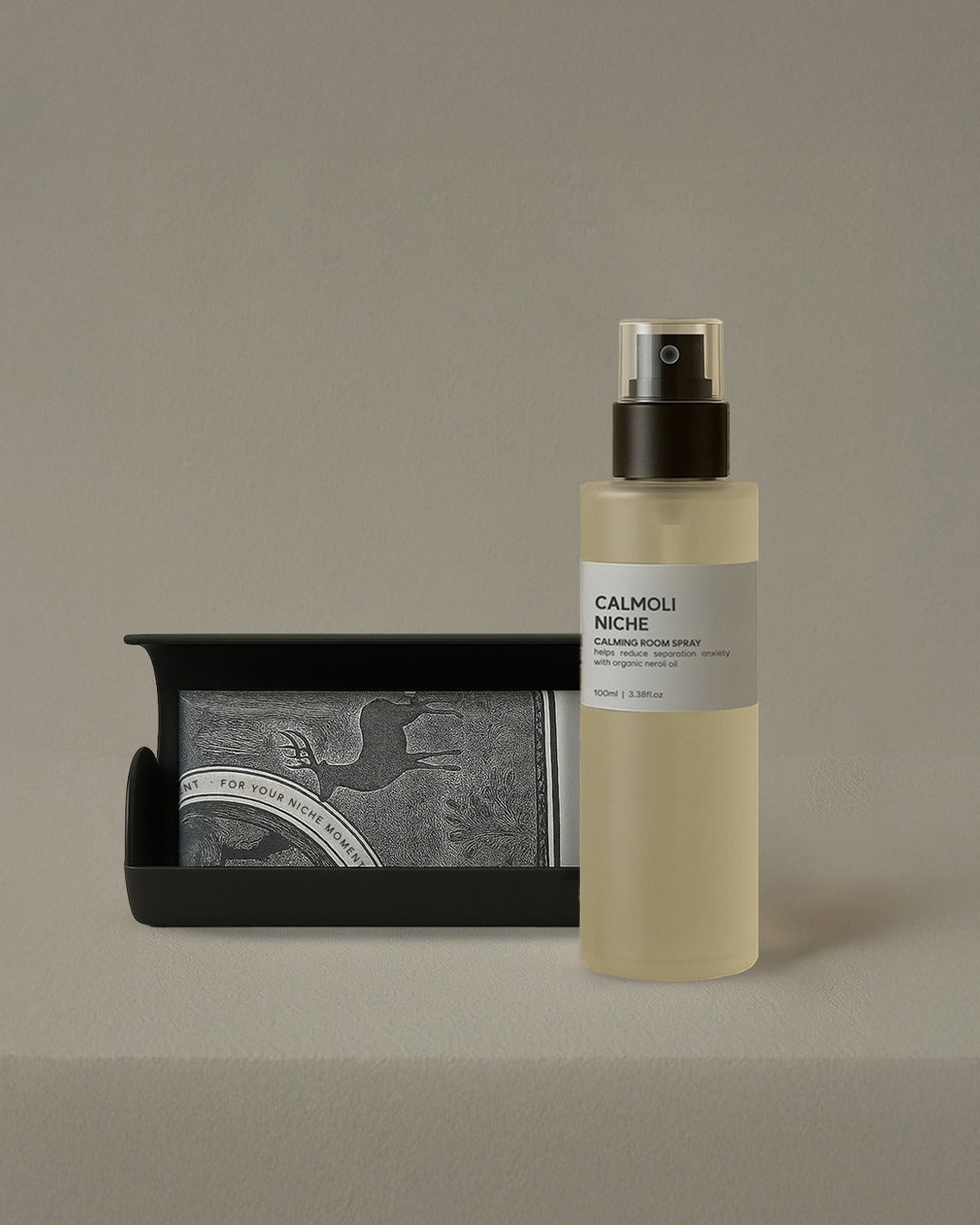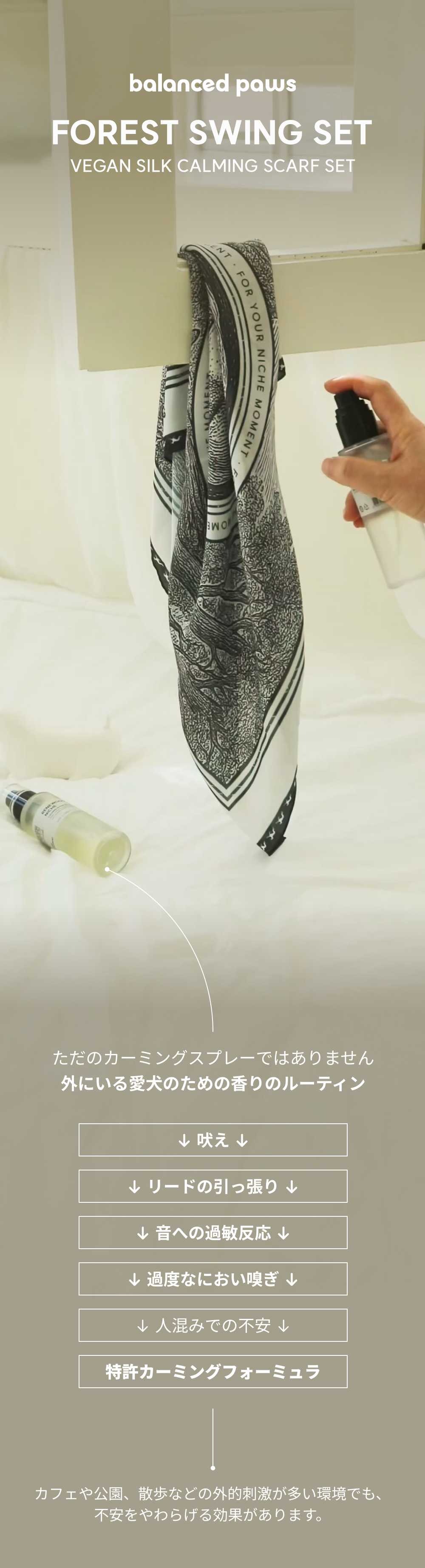 ヴィーガンシルク素材で作られたフォレストスウィングスカーフは、軽やかでやわらかな肌触りが特徴で、香りをやさしく纏います。移動中や休息中でも愛犬が安心感を得られるように設計されたファブリックアイテムで、どんなカーミングルームスプレーとも併用できます。特にニッチスプレーを軽く吹きかけると、香りが長く続き、吠えや不安、落ち着かない行動を効果的に和らげます。