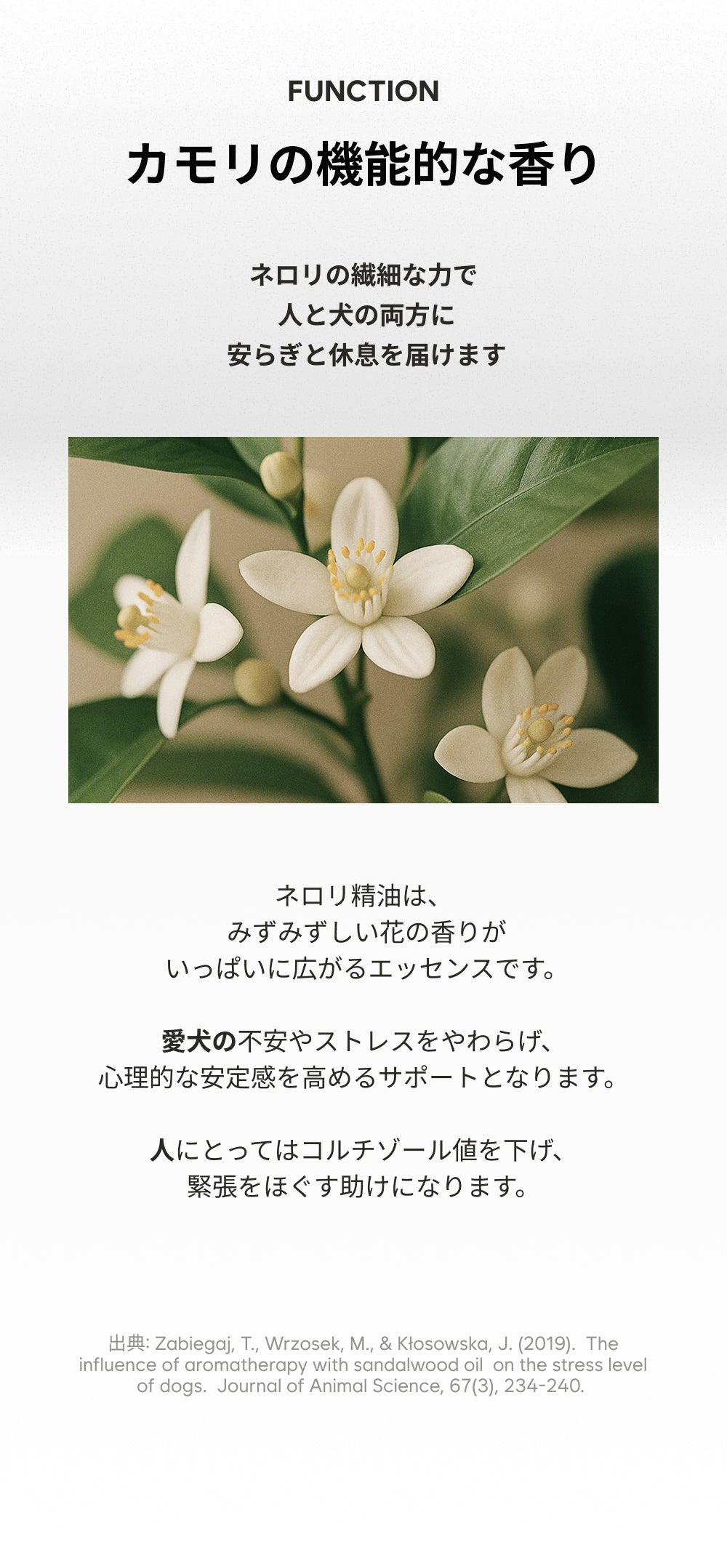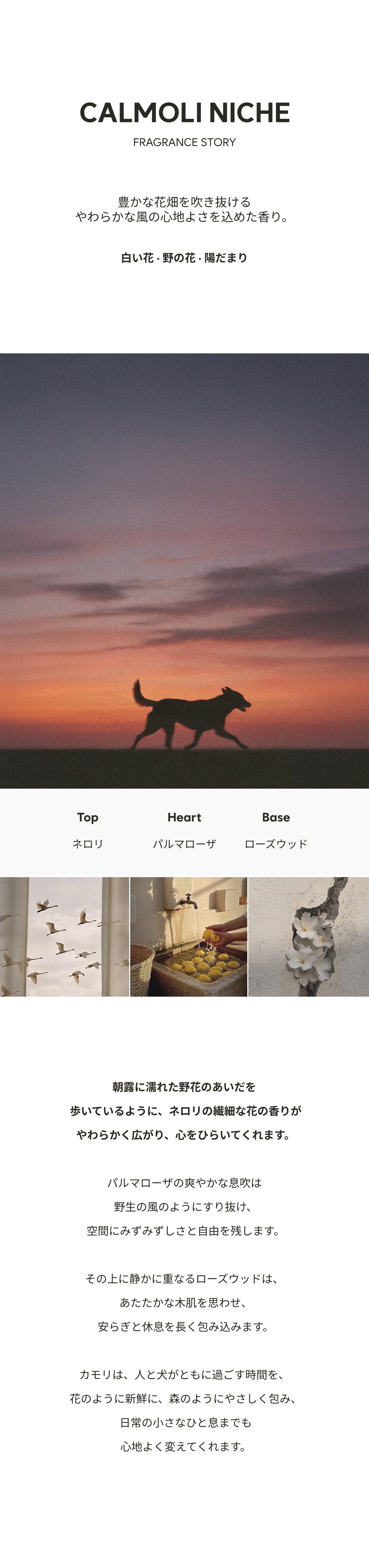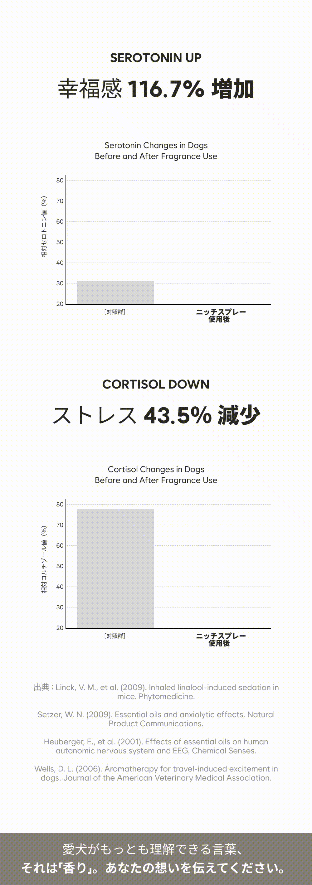 ヴィーガンシルク素材で作られたフォレストスウィングスカーフは、軽やかでやわらかな肌触りが特徴で、香りをやさしく纏います。移動中や休息中でも愛犬が安心感を得られるように設計されたファブリックアイテムで、どんなカーミングルームスプレーとも併用できます。特にニッチスプレーを軽く吹きかけると、香りが長く続き、吠えや不安、落ち着かない行動を効果的に和らげます。