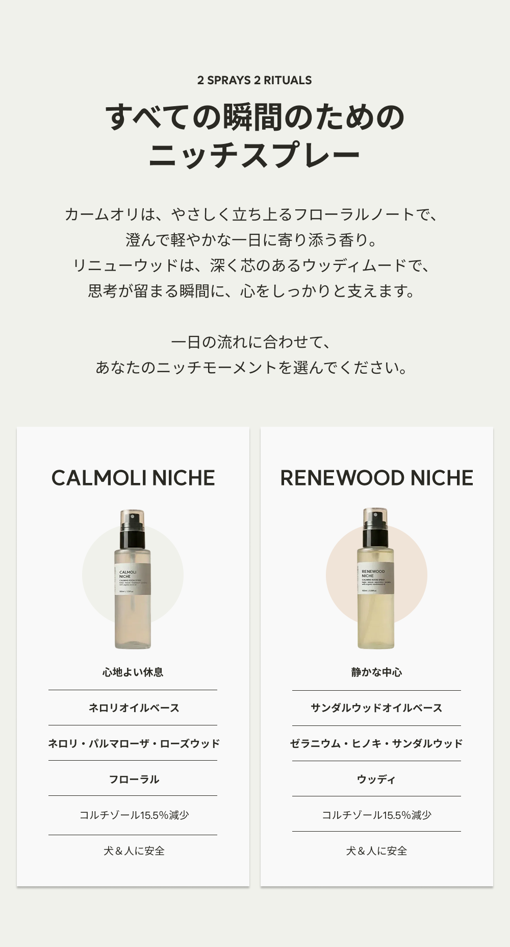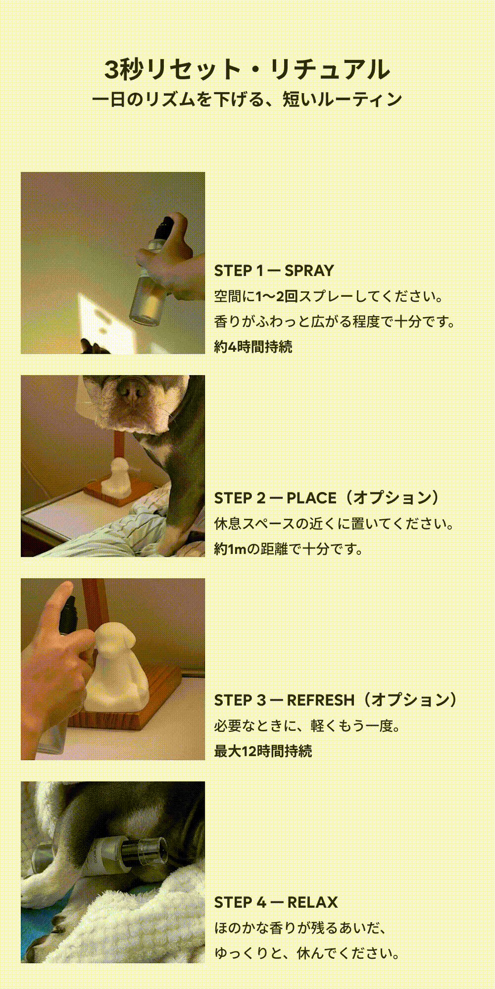 スプレーをひと吹きするだけで、心を落ち着かせてくれる香りが部屋全体にやさしく広がります。朝の身支度や、寝る前の静かなルーティンにぴったりです。