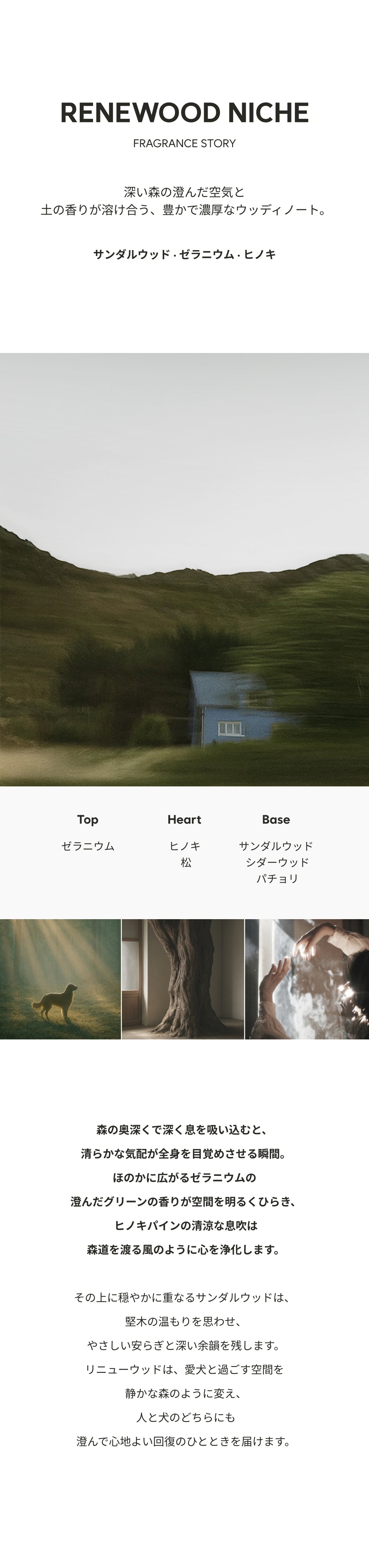 深い森の澄んだ空気と土の香りが溶け合う、