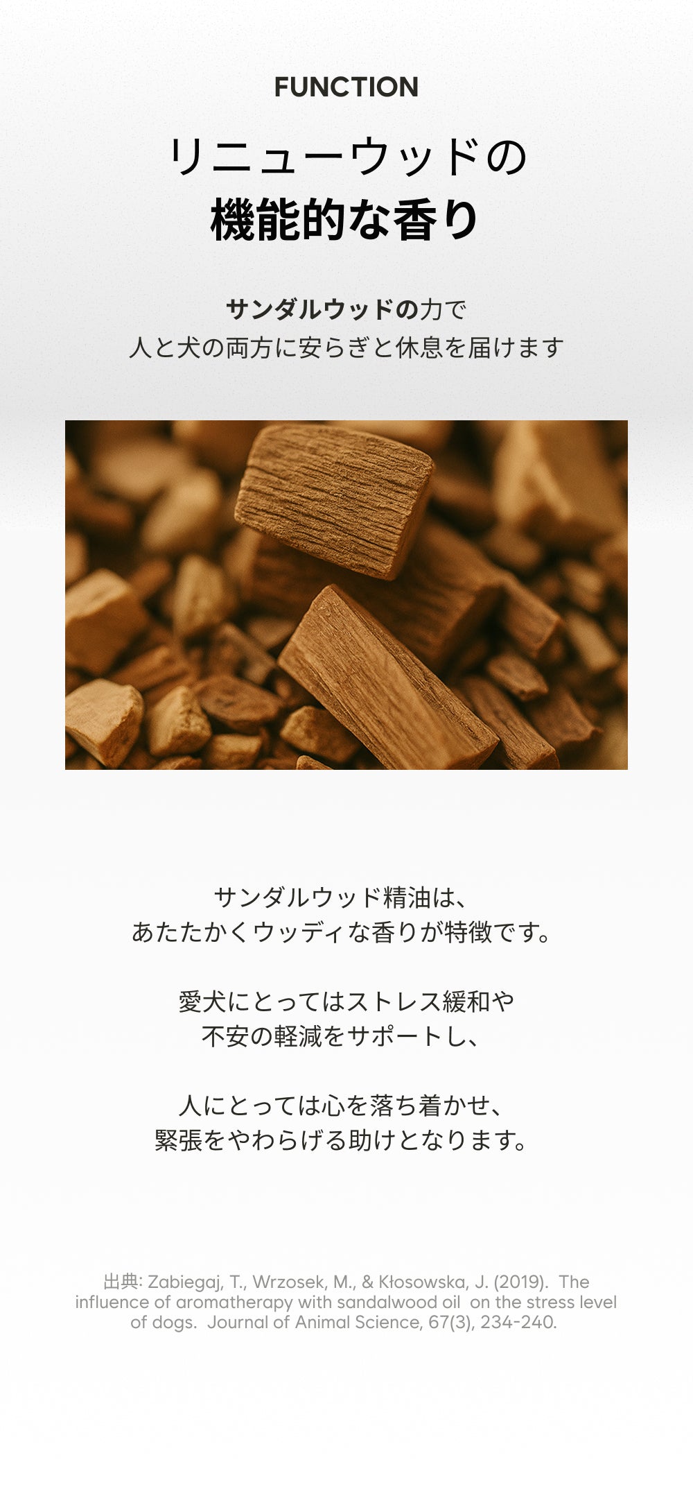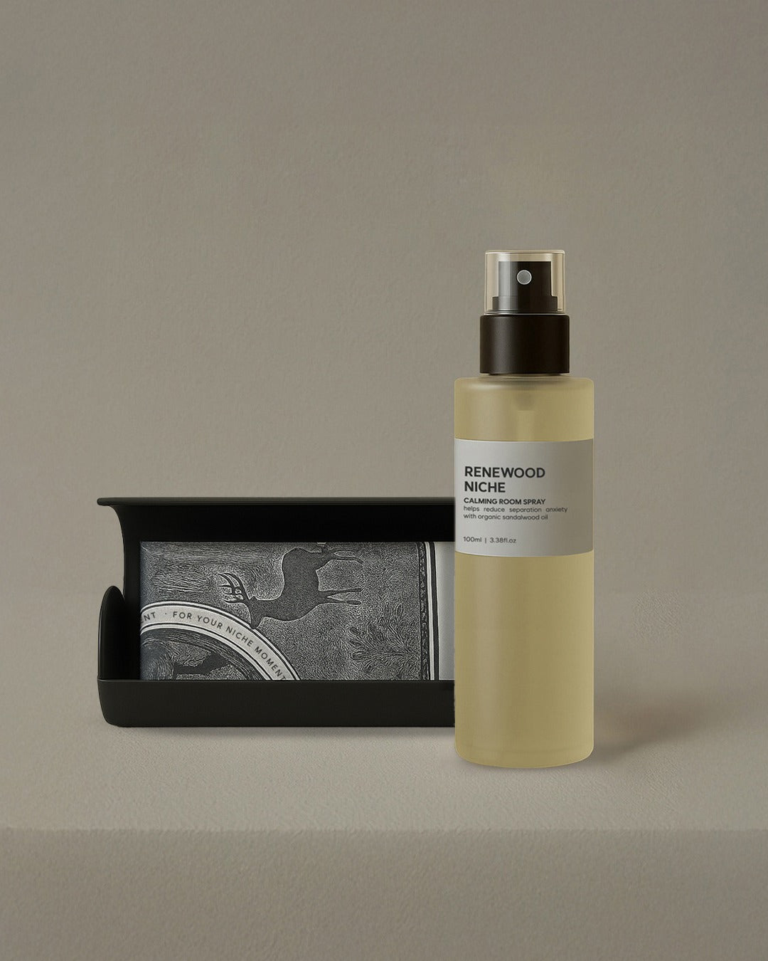 ヴィーガンシルク素材で作られたフォレストスウィングスカーフは、軽やかでやわらかな肌触りが特徴で、香りをやさしく纏います。移動中や休息中でも愛犬が安心感を得られるように設計されたファブリックアイテムで、どんなカーミングルームスプレーとも併用できます。特にニッチスプレーを軽く吹きかけると、香りが長く続き、吠えや不安、落ち着かない行動を効果的に和らげます。