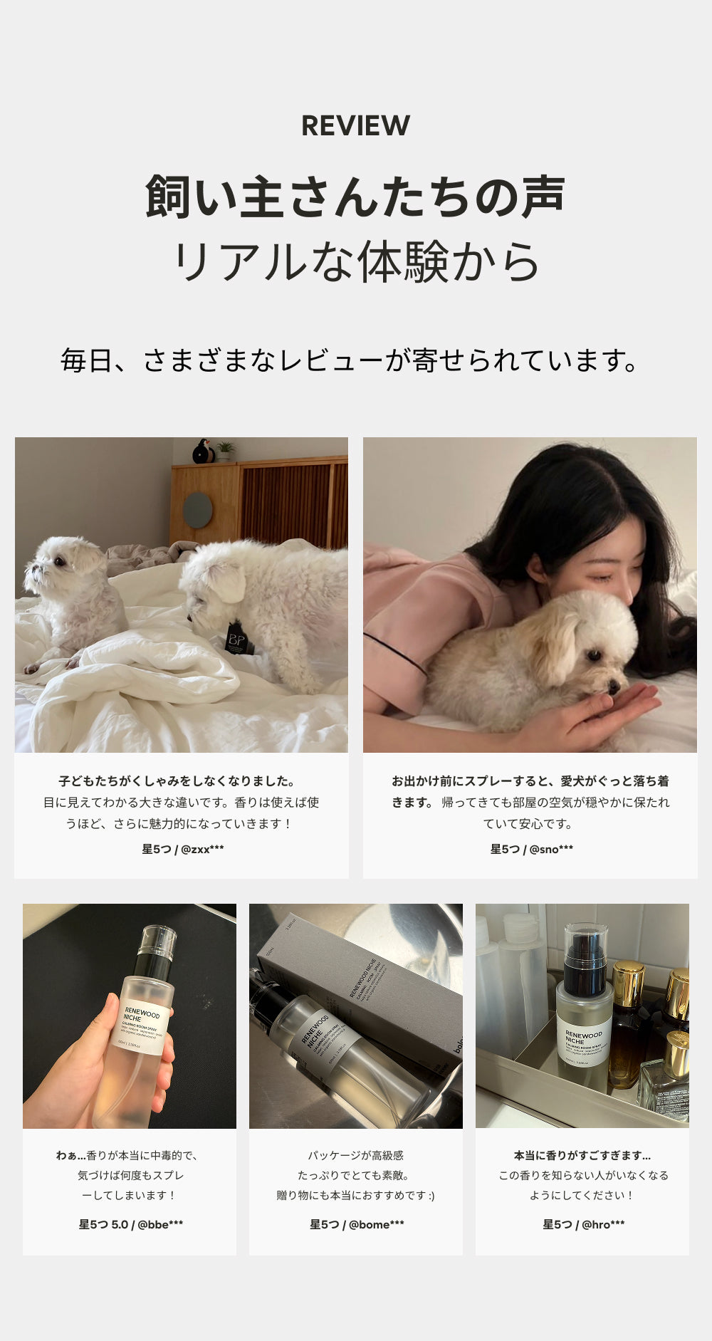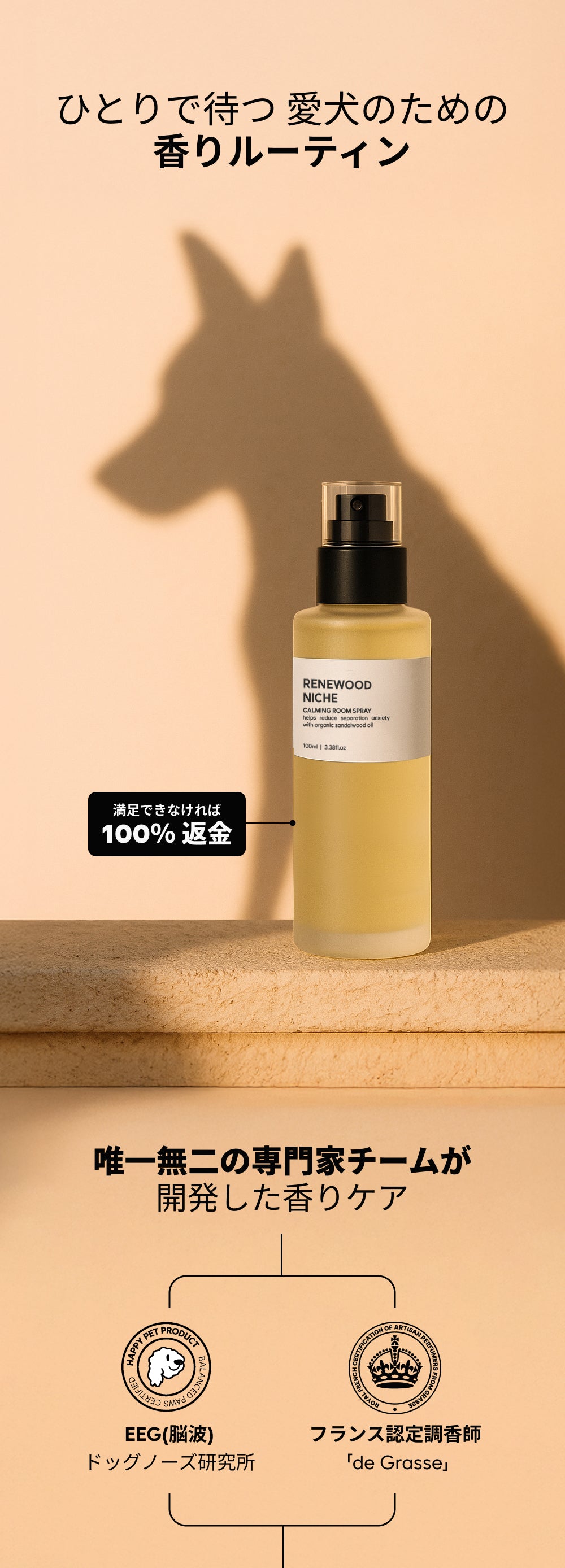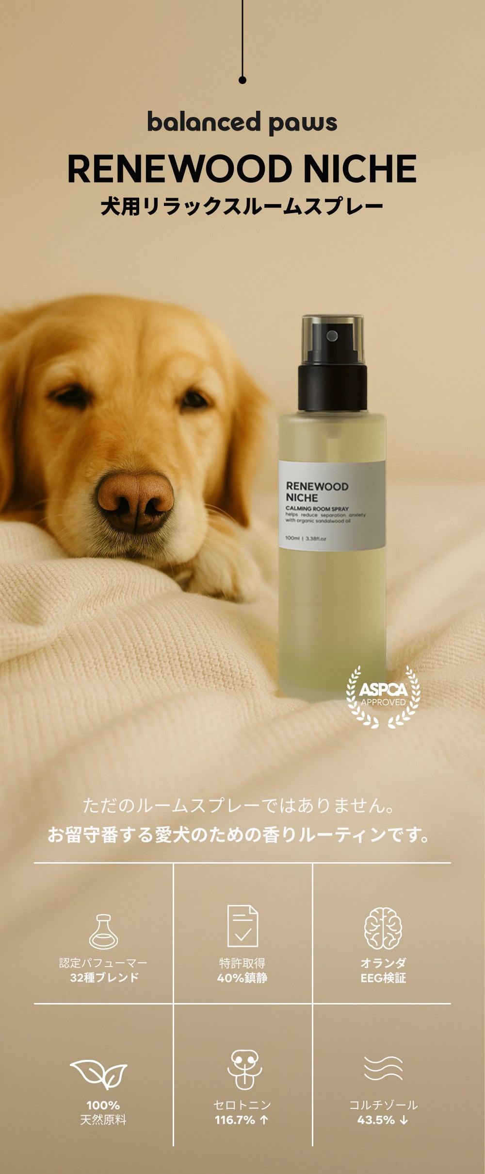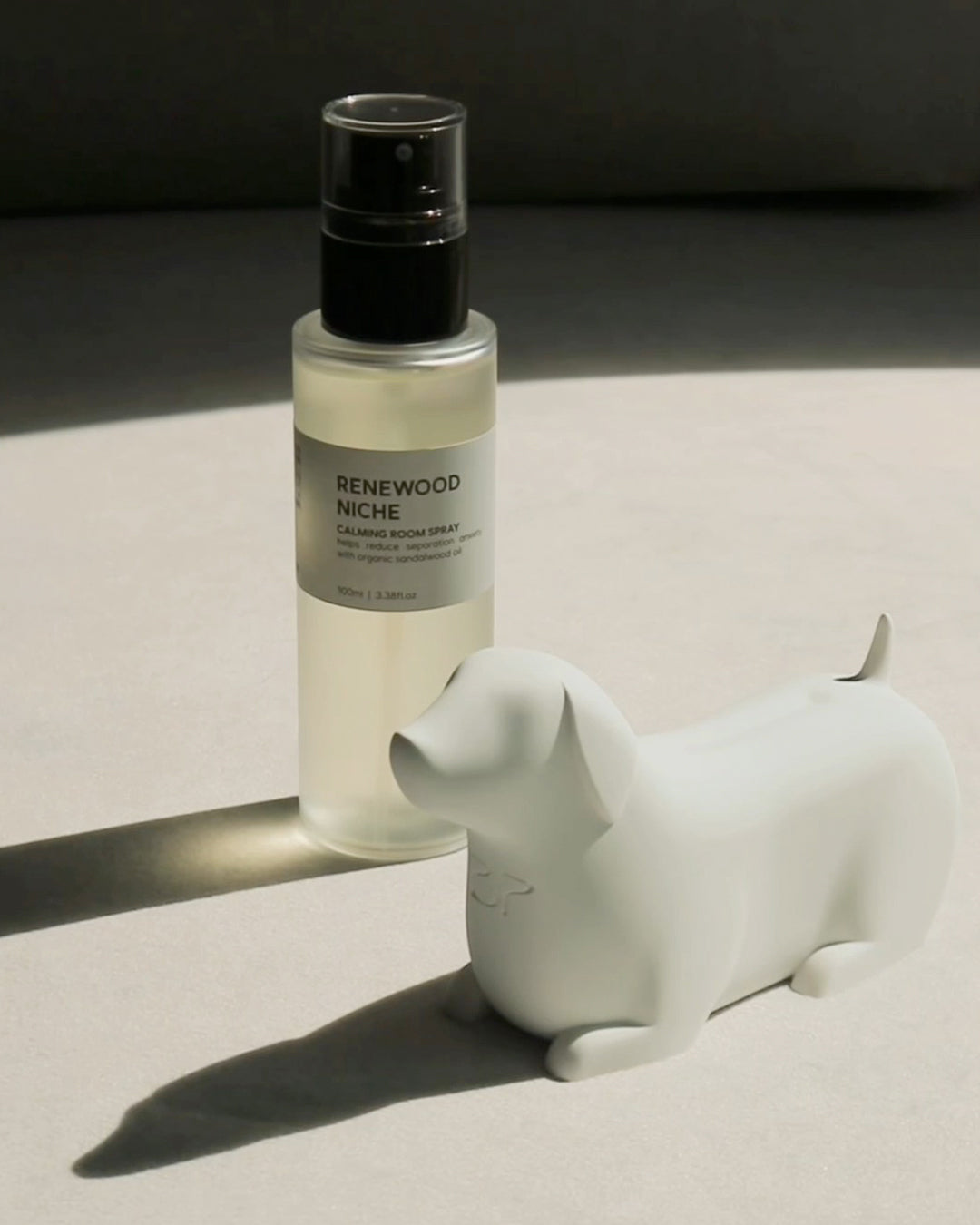 ペットと飼い主さんが安心して使えるように開発されたルームスプレー。自然由来の香りが、落ち着いた空気をつくります。