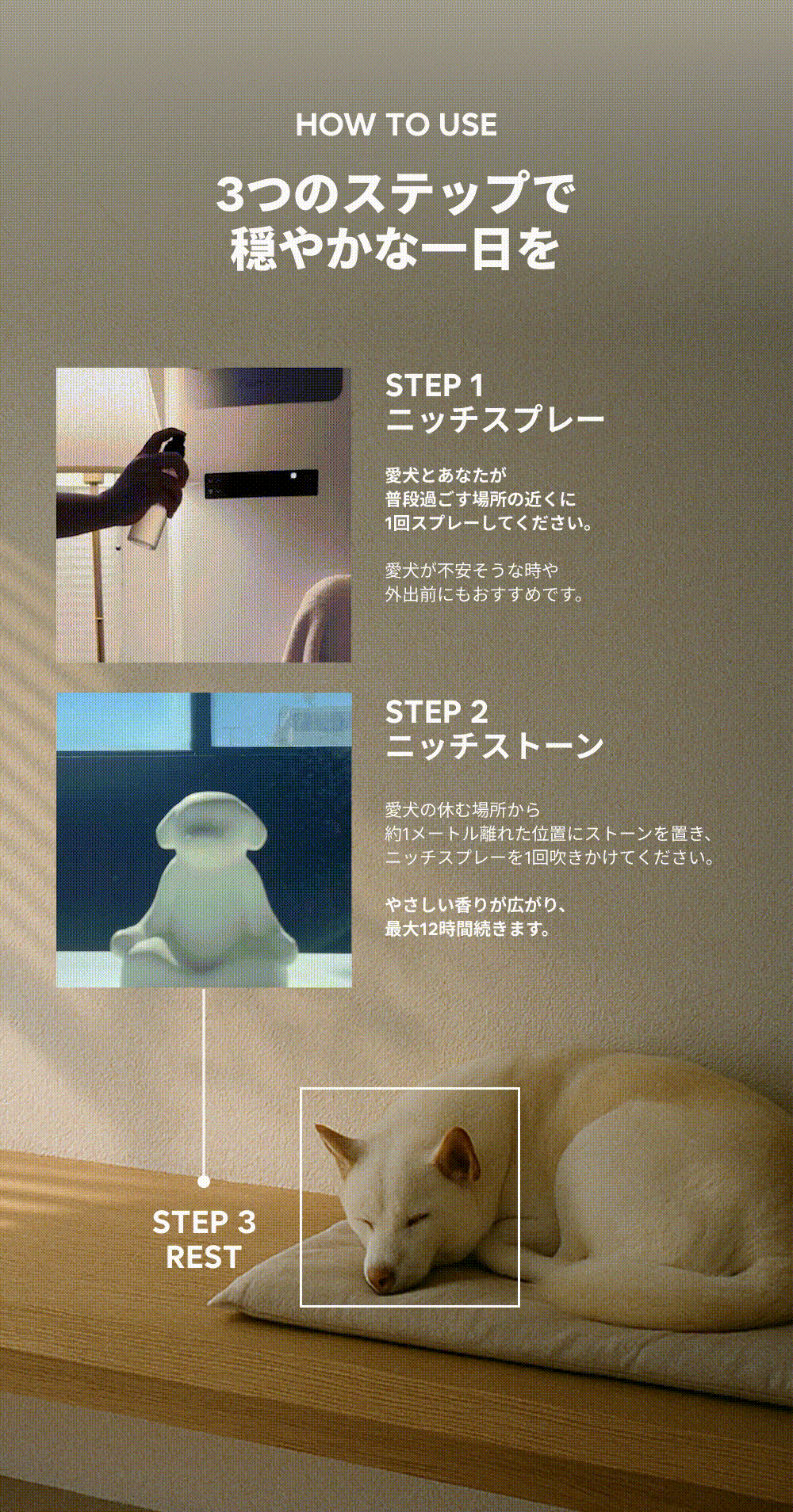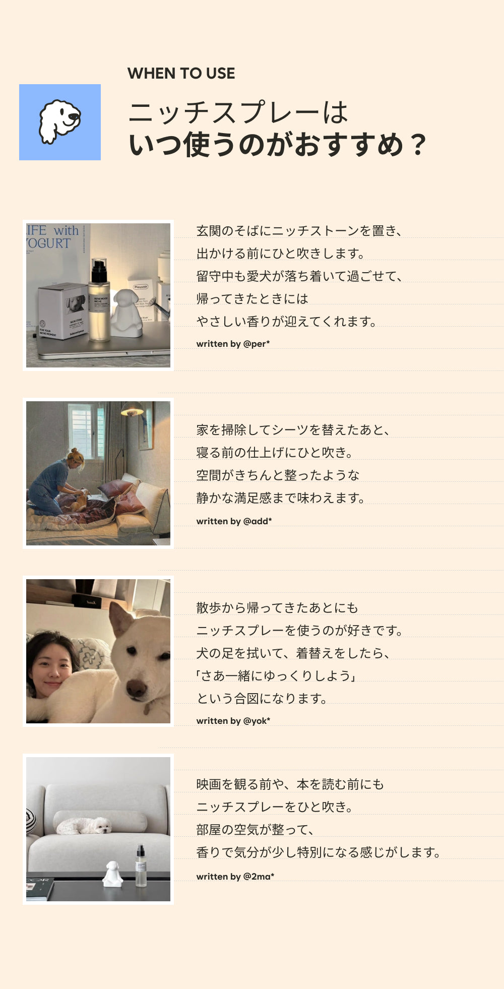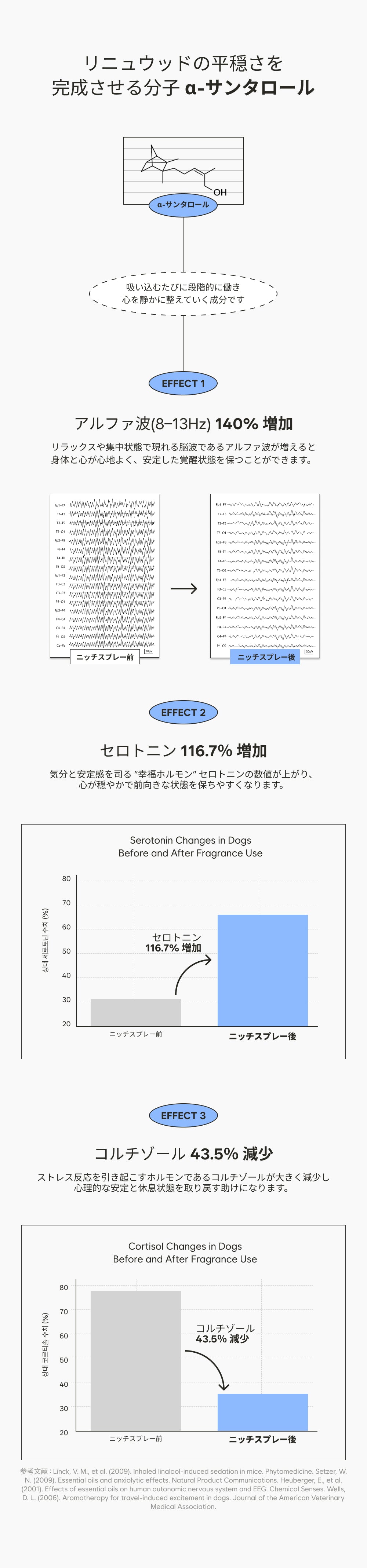 このスプレーは、100%天然の植物由来成分のみで作られています。植物から生まれた発酵アルコールと、100%天然のサンダルウッド精油をベースに調合した独自の精油ブレンドを配合しました。刺激の強い合成物質や石油系成分を一切使用せず、大切な家族と一緒に過ごす空間を、よりクリーンで安全にリフレッシュします。