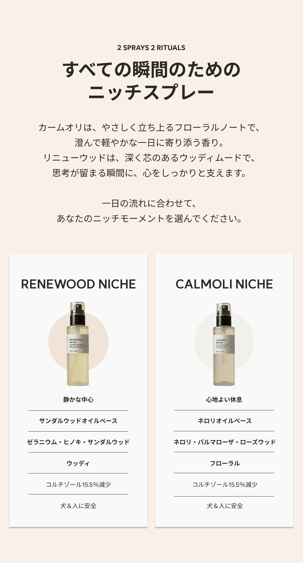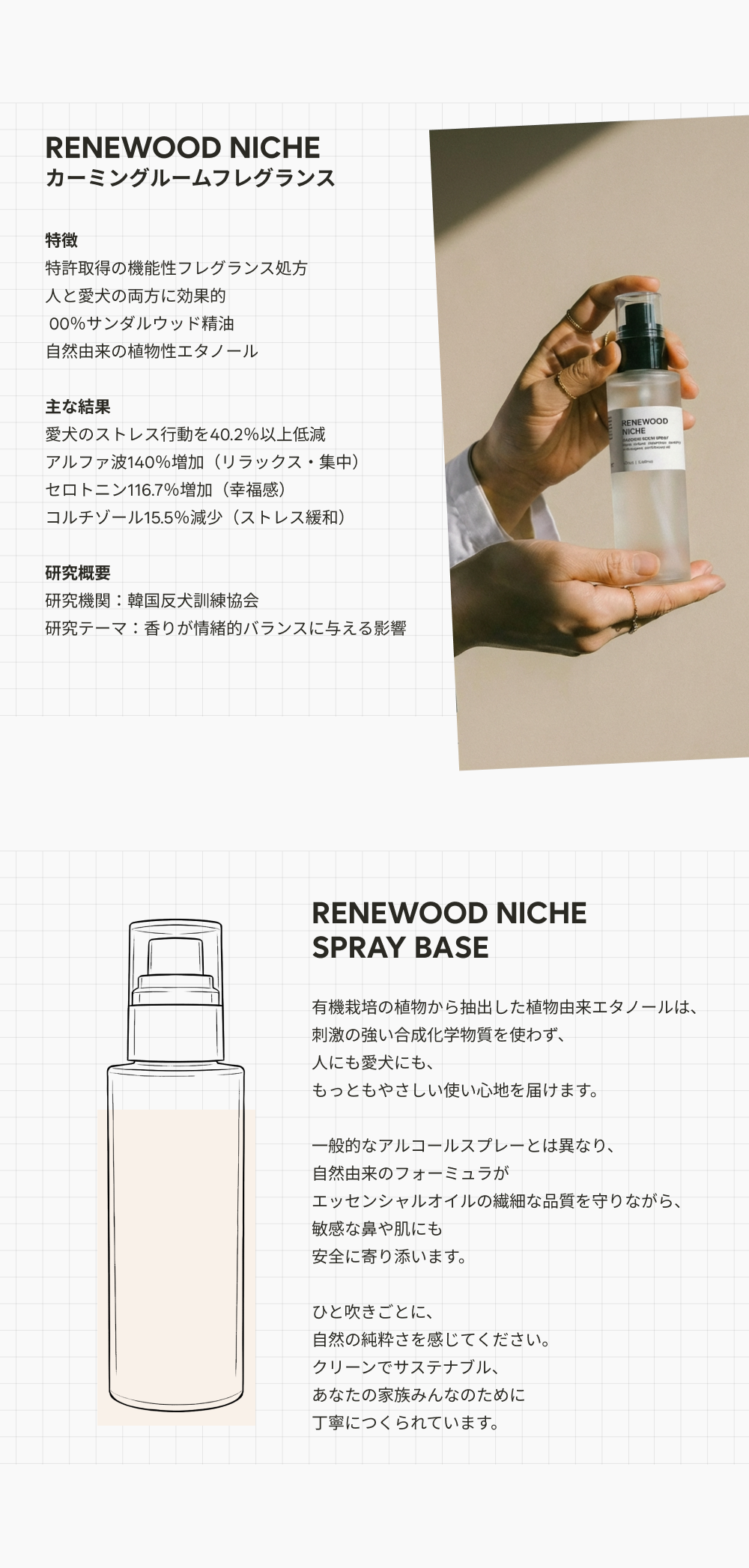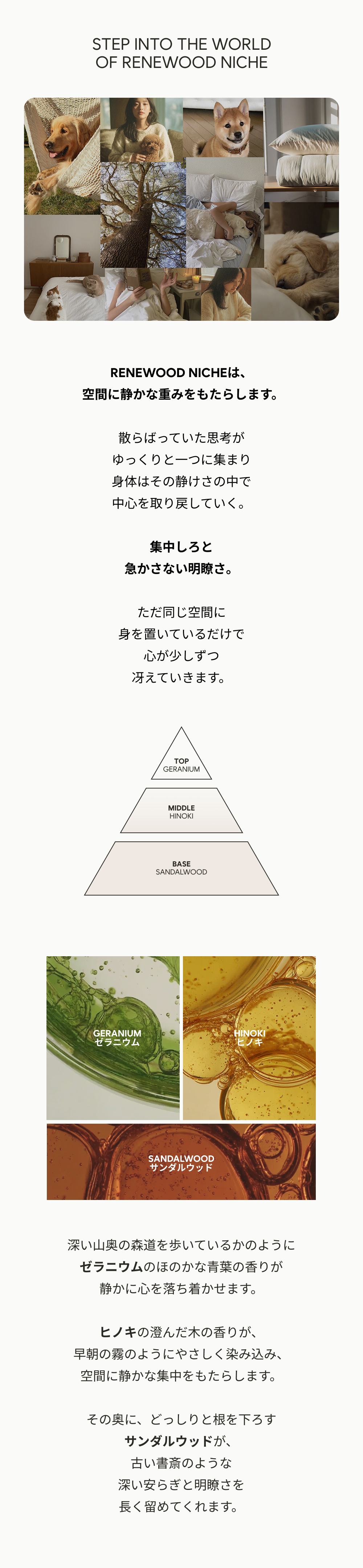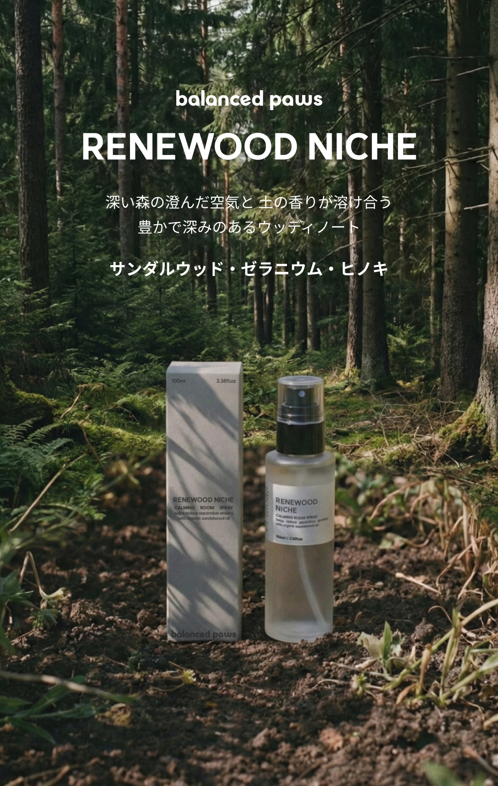 RENEWOOD NICHE セットは、愛犬の不安を瞬時に和らげ、空間に洗練された上質さを添えるために設計されたニッチフレグランス・ルームスプレーです。