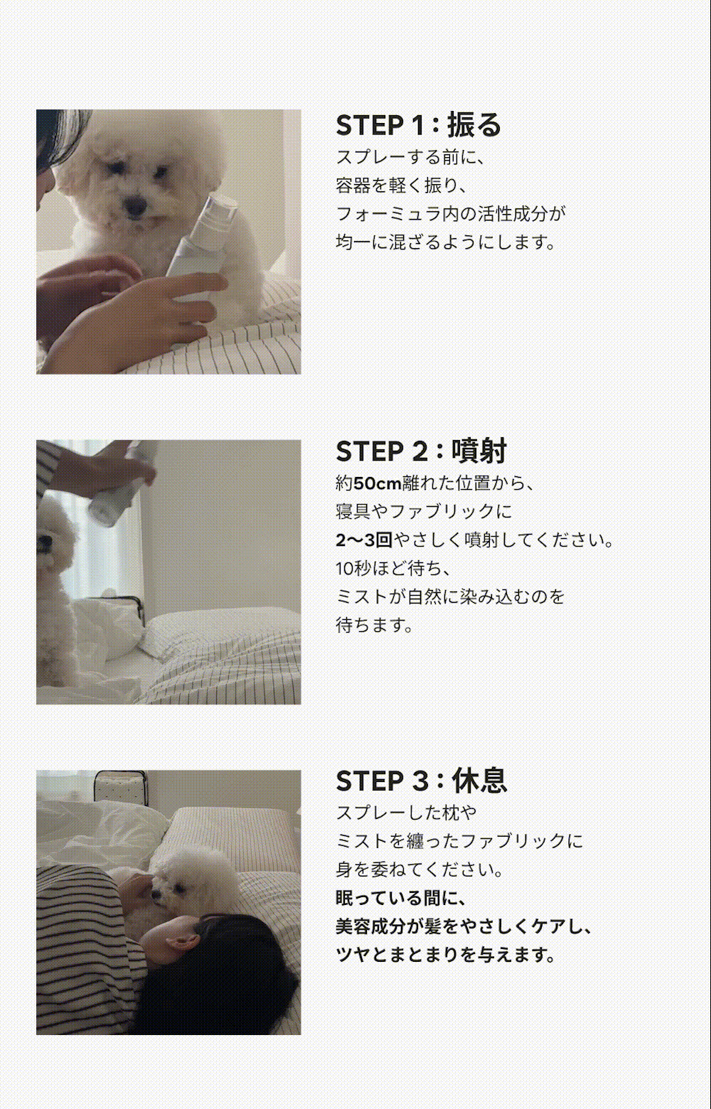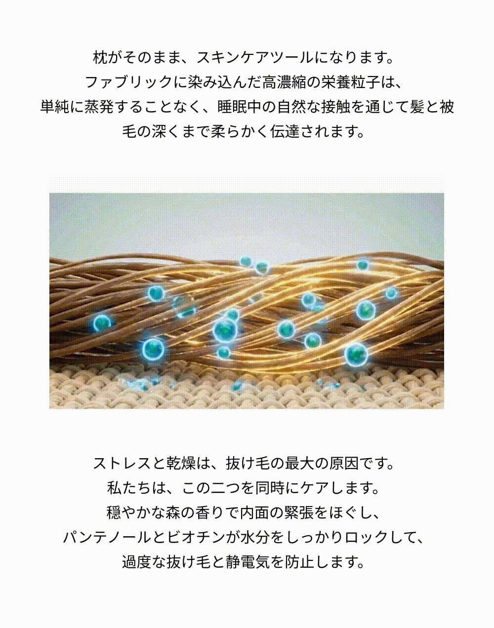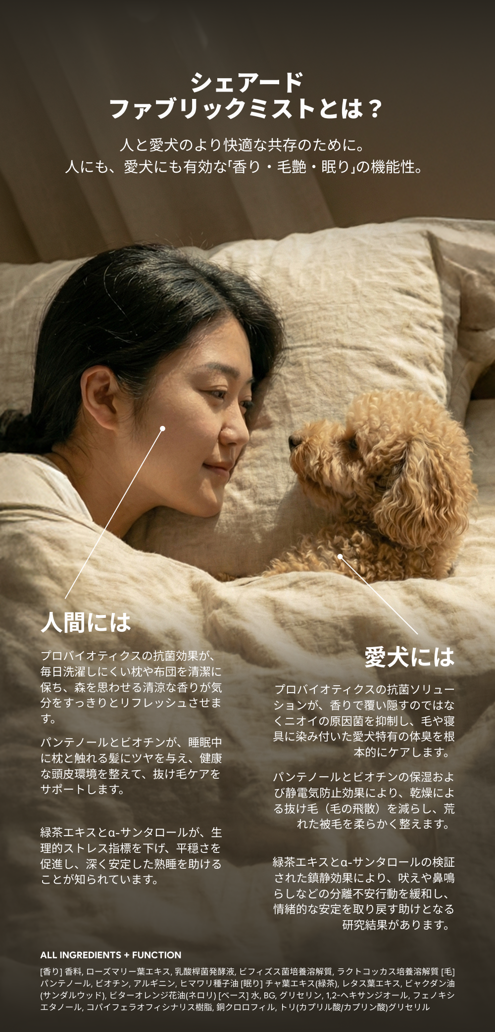 [香り] 香料, ローズマリー葉エキス, 乳酸桿菌発酵液, ビフィズス菌培養溶解質, ラクトコッカス培養溶解質 [毛] パンテノール, ビオチン, アルギニン, ヒマワリ種子油 [眠り] チャ葉エキス(緑茶), レタス葉エキス, ビャクダン油(サンダルウッド), ビターオレンジ花油(ネロリ)