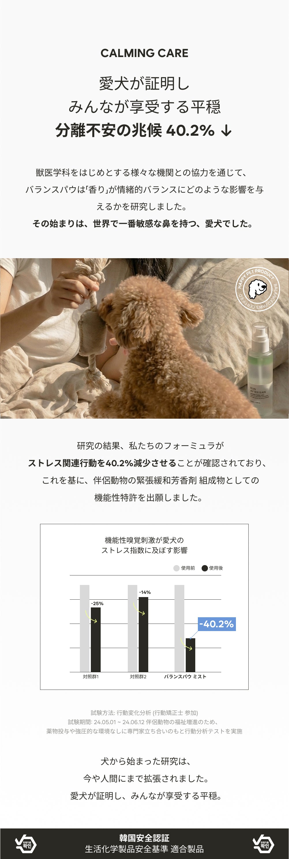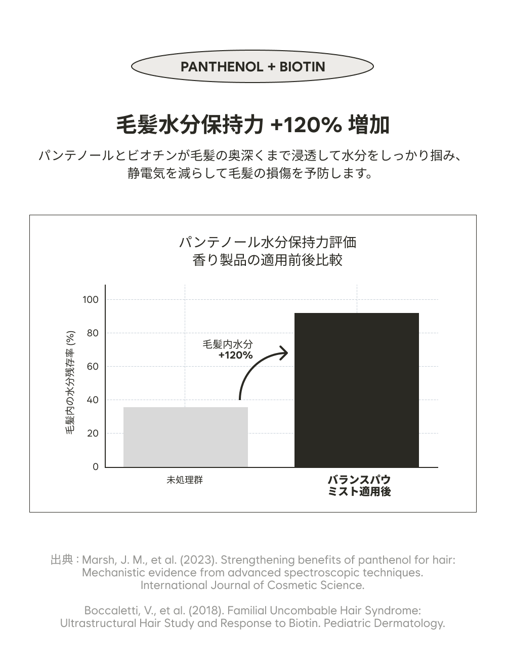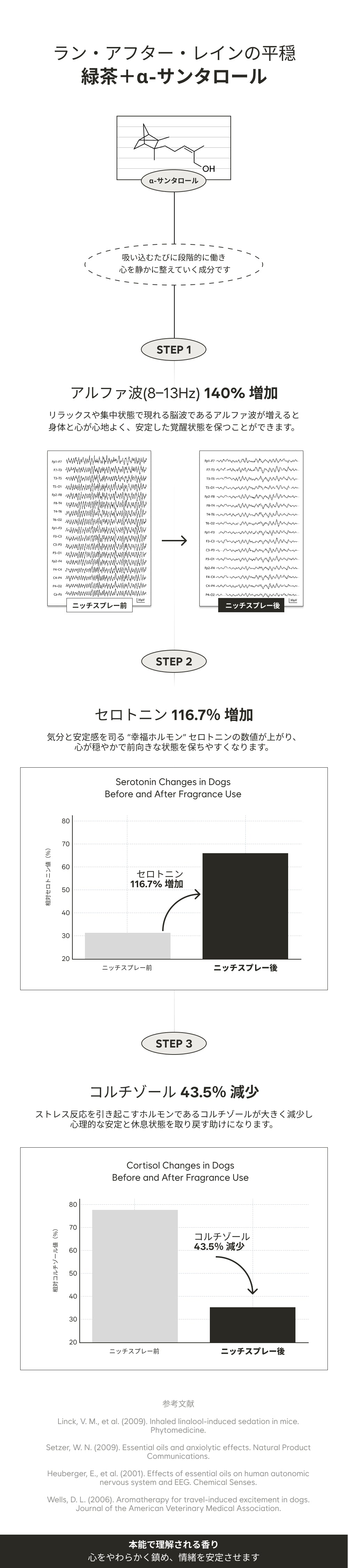 [香り] 香料, ローズマリー葉エキス, 乳酸桿菌発酵液, ビフィズス菌培養溶解質, ラクトコッカス培養溶解質 [毛] パンテノール, ビオチン, アルギニン, ヒマワリ種子油 [眠り] チャ葉エキス(緑茶), レタス葉エキス, ビャクダン油(サンダルウッド), ビターオレンジ花油(ネロリ)